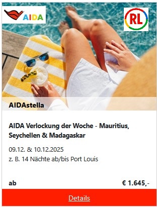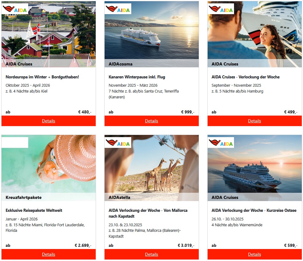 AIDA Kurzreisen Ostsee ab Warnemünde | AIDA Mini-Kreuzfahrt ab Kiel & Hamburg ab 449 € günstig bei Reiselotsen buchen. Aktionspreise Karibik 2-Wo mit Flug sowie beliebte 7 Tage Kanaren Kreuzfahrt inklusive Flug . Achte auf günstige Reise Angebote mit Bordguthaben. Buche Deine AIDA Reise beim Reisebüro Reiselotsen - gute Erreichbarkeit mit Fach-Beratung Sofortbestätigung