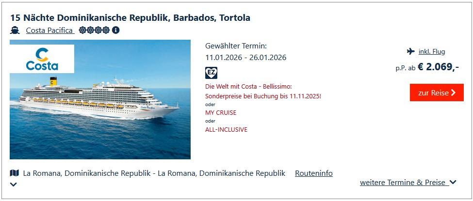 Costa Karibik Kreuzfahrt November Dezember 2025 & Costa Karibik Frühbucher 2026