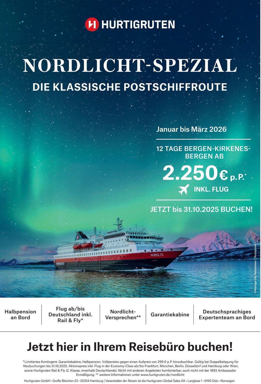 Hurtigruten Kreuzfahrt inclusive Flug 2026 ab 1.999,- Euro